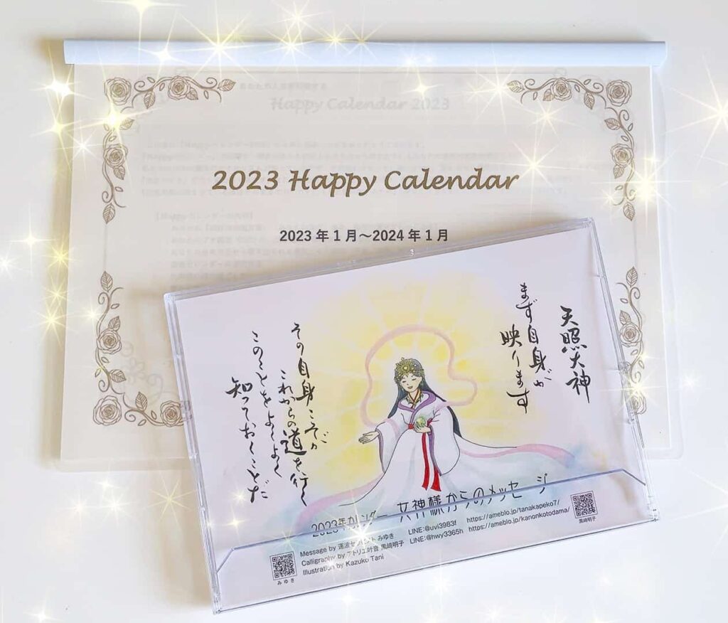 書き込みができ夢がどんどん叶うA4サイズのカレンダーと、見て楽しめ、毎月神様からのメッセージが受け取れる卓上カレンダーの2点セットで2023年を最強で最高の1年にしていきましょう。